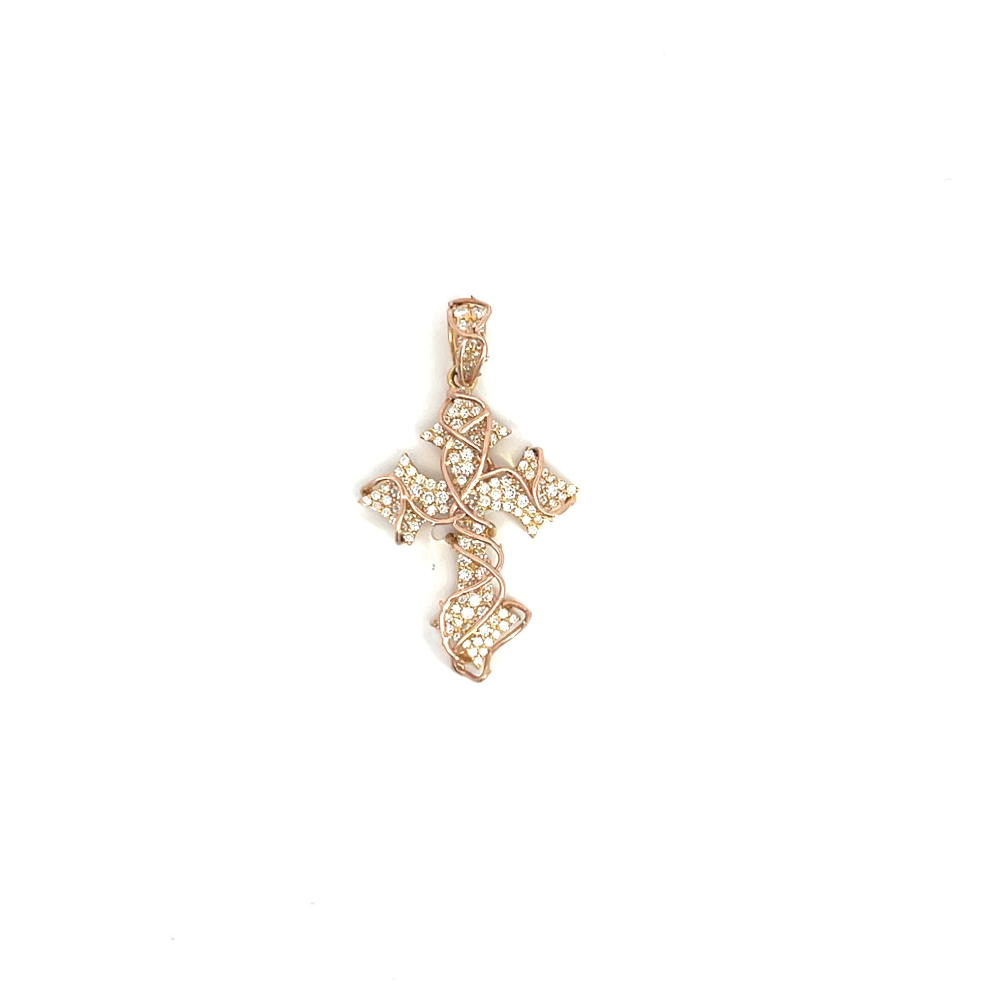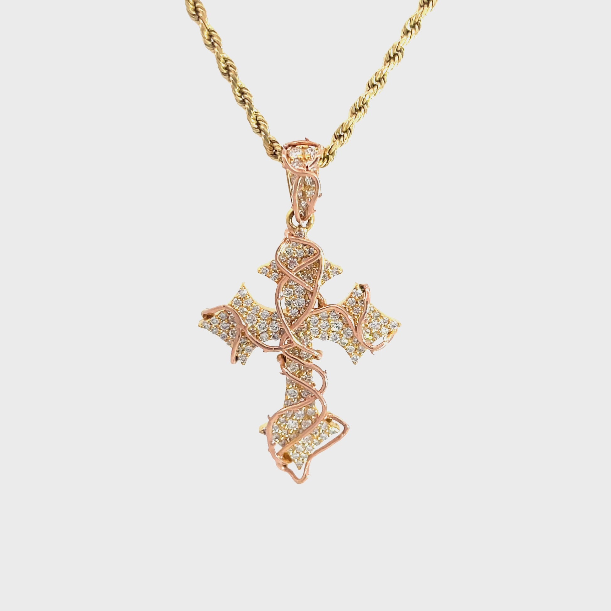 Introducing our Thorn Vine Cross Pendant, crafted in 14k gold and adorned with natural or lab diamonds. The striking yellow gold cross is complemented by a delicate rose gold thorn vine, creating a beautiful two tone design.